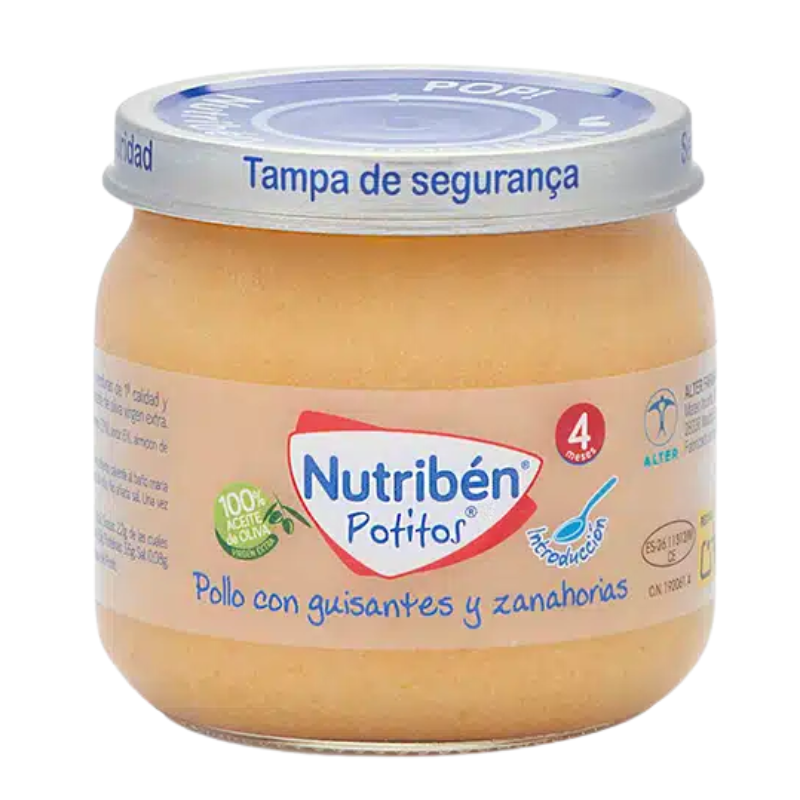 Este potito de pollo con guisantes y zanahorias está elaborado para alimentar a tu bebé a partir de los 6 meses, dentro de una dieta variada, aportándole los nutrientes de la carne y también, los de las verduras.