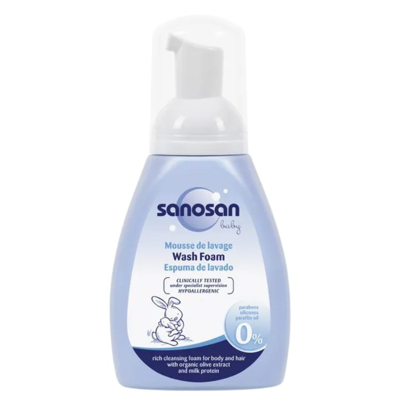 La espuma de lavado Sanosan es cremosa, con extracto de oliva orgánico y proteínas de la leche limpia que la piel y el cabello del bebé con suavidad. Nuestra rica fórmula en crema contiene detergentes muy suaves y conserva la película hidrolipídica natural de la delicada piel del bebé. Su fórmula natural no contiene aceite de parafina, colorantes, siliconas o parabenos. La compatibilidad de con la piel ha sido probada clínicamente. Recomendado por matronas.