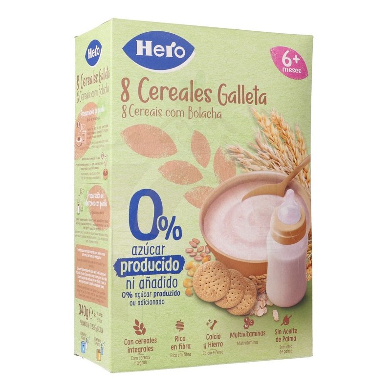 Hero 8 cereales con galleta para niños de más de 6 meses sólo contiene los azúcares naturales procedentes de los cereales.
