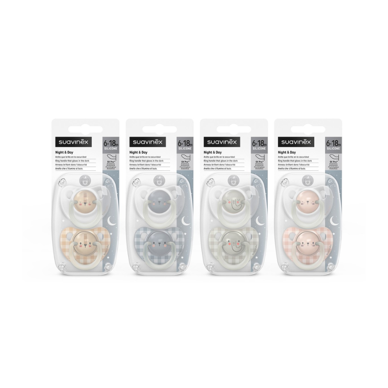 Chupetes Night & Day para bebés de 0 a 6 meses con tetina anatómica de silicona y anillas luminiscentes que brillan en la oscuridad. Color sujeto a disponibilidad.