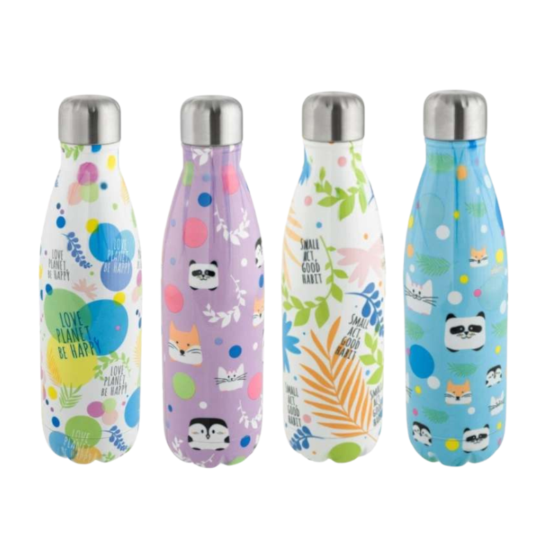 Botellas de acero inoxidable, térmicas y reutilizables.