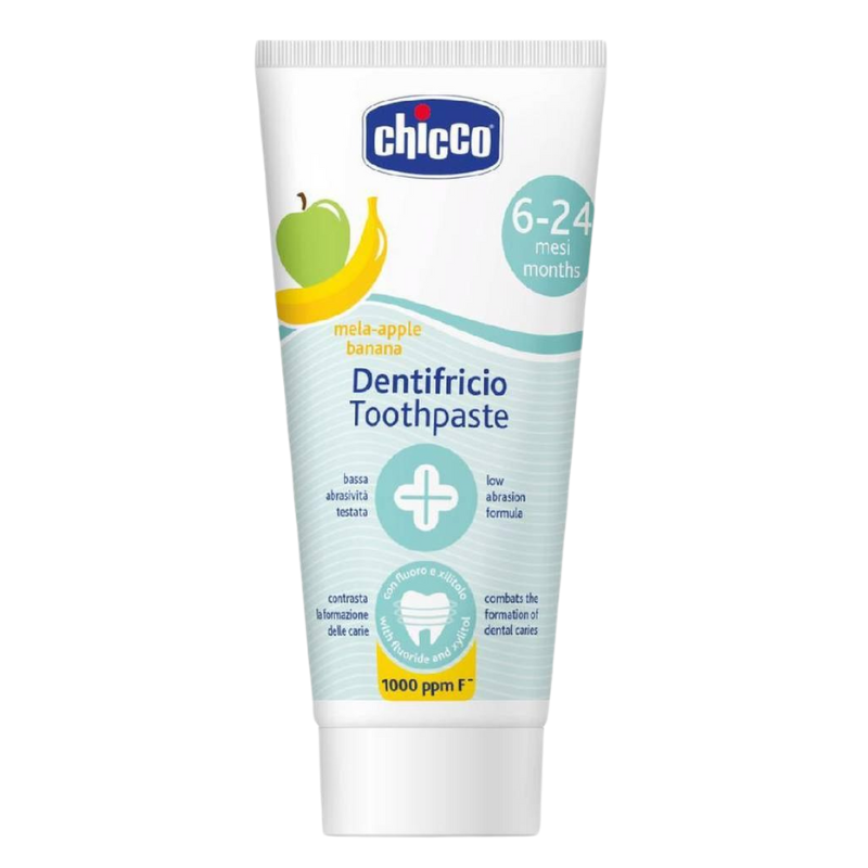 Pasta de dientes con flúor sabor plátano y manzana para bebés de 6 a 24 meses.