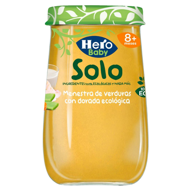 Vegetales ecológicos (50%)(patata ecológica, zanahoria ecológica, judia verde ecológica, cebolla ecológica y apio ecológico), agua de cocción, leche descremada ecológica, dorada ecológica (5,5%), aceite de oliva virgen ecológico (1,8%), arroz ecológico y zumo de limón ecológico.