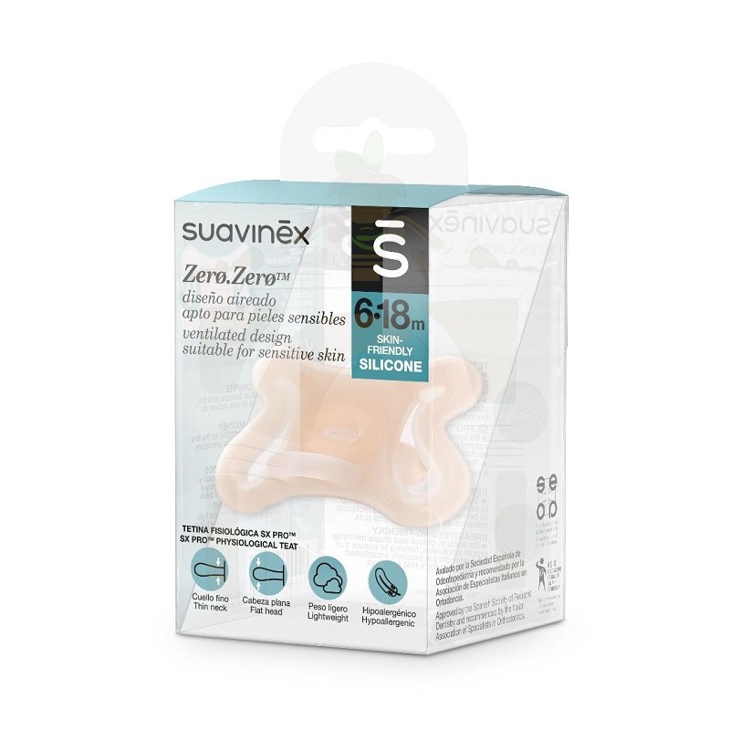 Chupete con tetina fisiológica SX Pro, diseñado para respetar el desarrollo bucodental del bebé.