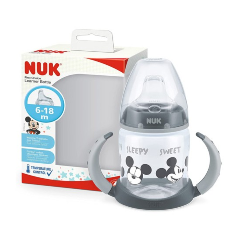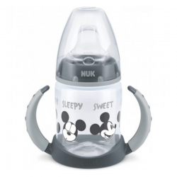 El Biberón FC Entrena 150 ml Mickey Mouse Silicona NUK simplifica la transición del pequeño para empezar a beber solo gracias a la boquilla hecha
