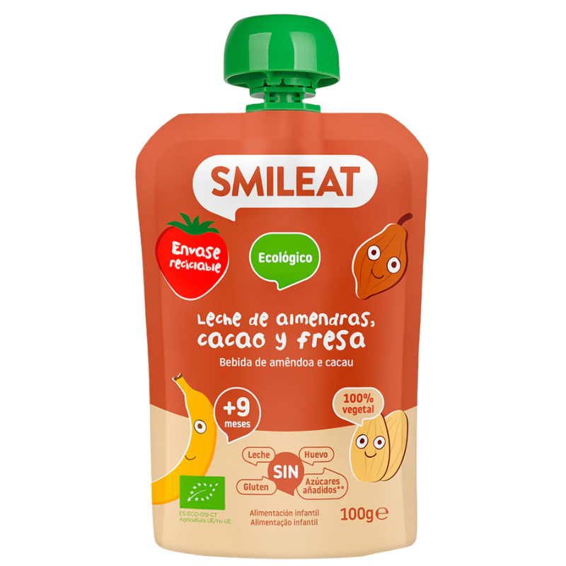 Este pouch ecológico de bebida vegetal es una maravillosa combinación entre leche de almendras, fresa, cacao, manzana y plátano.