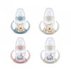 Limpieza de biberones, tetinas y accesorios: Antes de usarla por primera vez, colóquela en agua hirviendo durante 5 minutos, utilice suficiente agua para evitar dañar la tetina. Para garantizar la higiene, límpiela bien con un líquido limpiador suave y esterilícela antes de volver a usarla. Recomendamos el NUK Vapo Rapid para la esterilización. Para hervir el biberón o para esterilizarlo por vapor (temperatura superior a 80 °C), desmonte siempre todas las piezas y déjelo abierto, ya que de lo contrario se puede deformar. Algunos nutrientes de determinadas bebidas (por ejemplo el zumo de zanahorias) puede cambiar el color del material o su olor (por ejemplo la infusión de hinojo). Esto no produce ningún deterioro del biberón, y no afecta a su aptitud para el uso ni a su seguridad. Las tetinas y los biberones no son aptos para el lavavajillas - los detergentes podrían dañar el material. Esterilizar en el microondas, usando el Esterilizador Microondas NUK para evitar daños en el material.