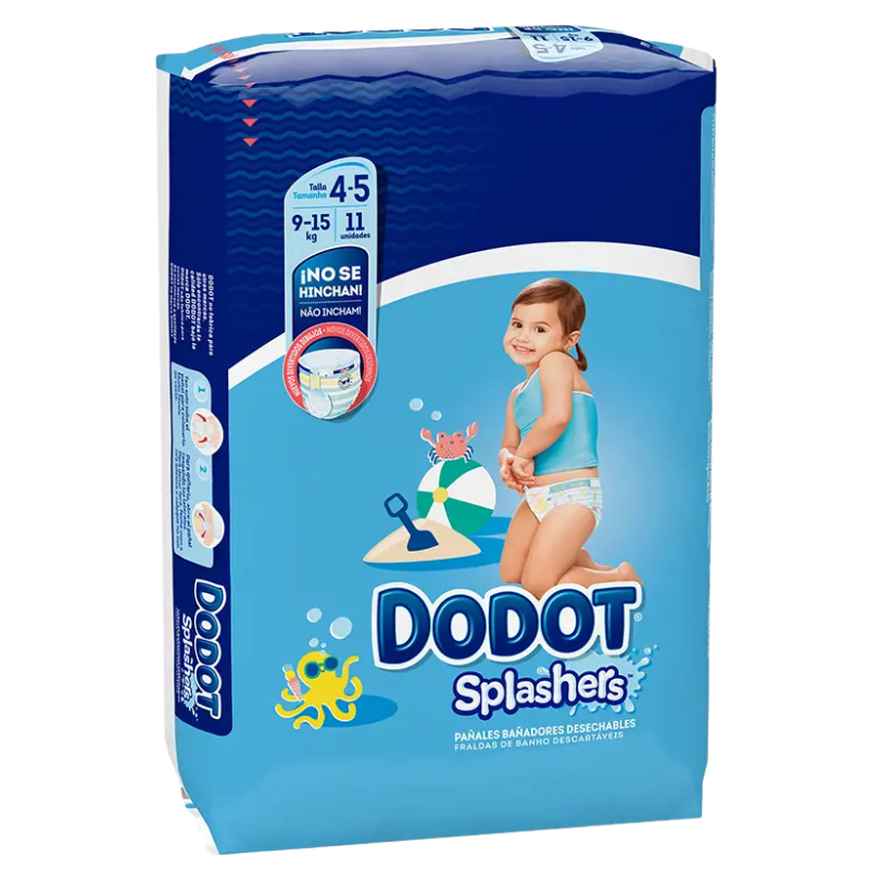 Se trata de un bañador y al mismo tiempo pañal listo para ofrecer al pequeño un baño divertido y sin preocupaciones. Han sido diseñados con divertidos dibujos asociados a imágenes infantiles, por lo que tales bañadores se asemejan a la perfección a los bañadores que no son desechables. Estos bañadores/pañales de Dodot se abren y se cierran con total facilidad, contando con la ventaja de que no se despegan en el interior del agua. Además, estos bañadores cuentan con un avanzado diseño, con el que evitaremos que éstos se hinchen dentro del agua.