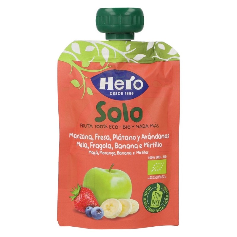 Las bolsitas de Manzana, Fresa, Plátano y Arándanos de Hero Solo están elaboradas con ingredientes 100% ecológicos y nada más.