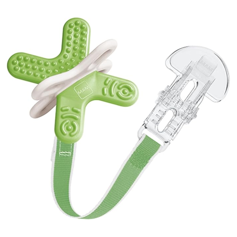 Mordedor MAM pequeño color verde con broche para la zona de los dientes posteriores de bebés a partir de cuatro meses.