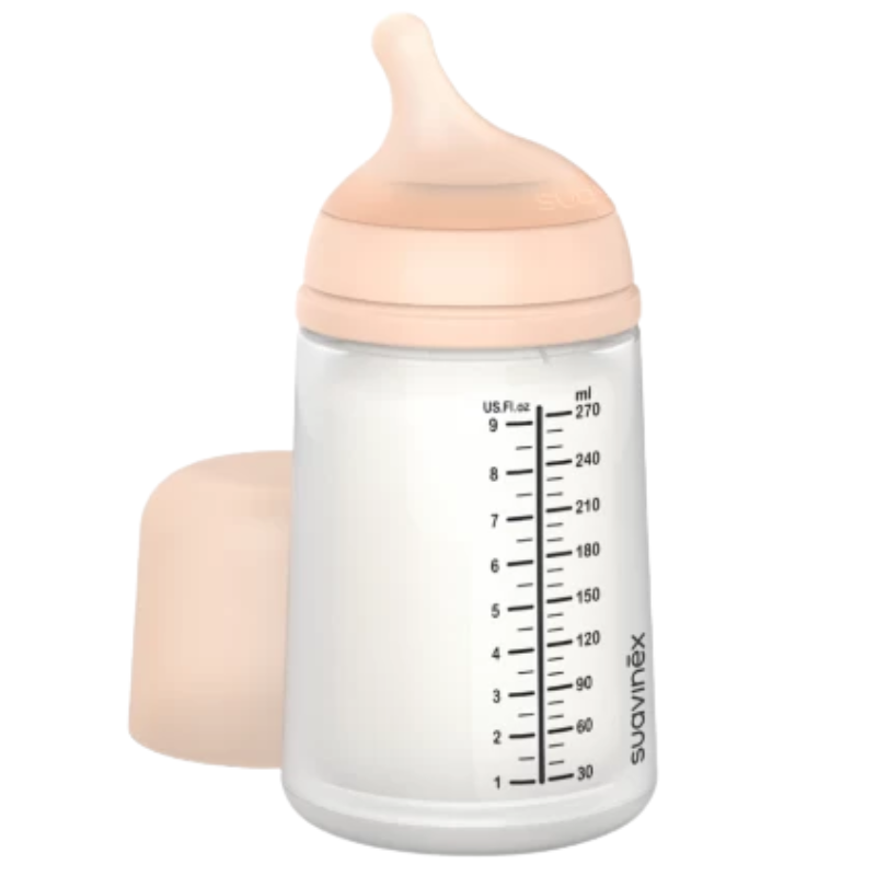 Biberón anticólico con tetina de lactancia.Ángulo inclinado. Forma plana y simétrica.Color piel.Superfina.Diseñada para parecerse lo máximo posible al pezón materno y minimizar la confusión, posibilita que el bebé vuelva fácilmente al pecho o a cualquier otra tetina de biberón.