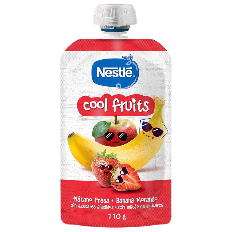 Alimento infantil elaborado con 100% de fruta natural a base de manzana, plátano y fres, lista para tomar en formato pouch.