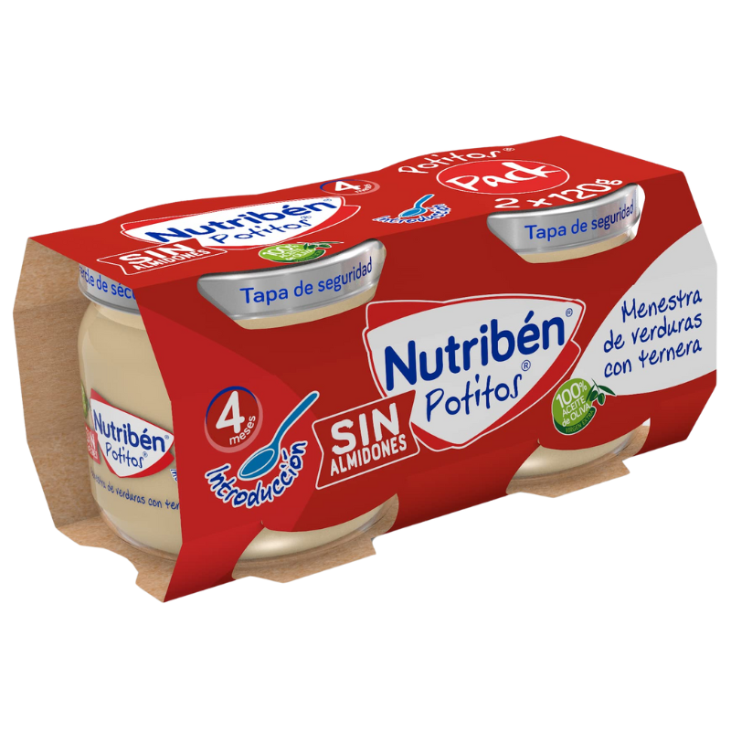 -El Potito Nutribén Menestra de Verduras con Ternera es ideal para introducir la carne a partir de los 4 meses, con ternera, judías verdes, tomates, zanahorias y guisantes.