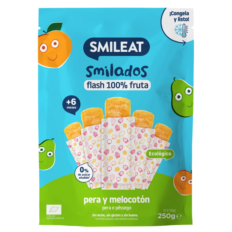 Smileat Smilado Pera y Melocotón es un snack congelado elaborado con peras y melocotones 100% ecológicos, ideal para bebés a partir de 6 meses.