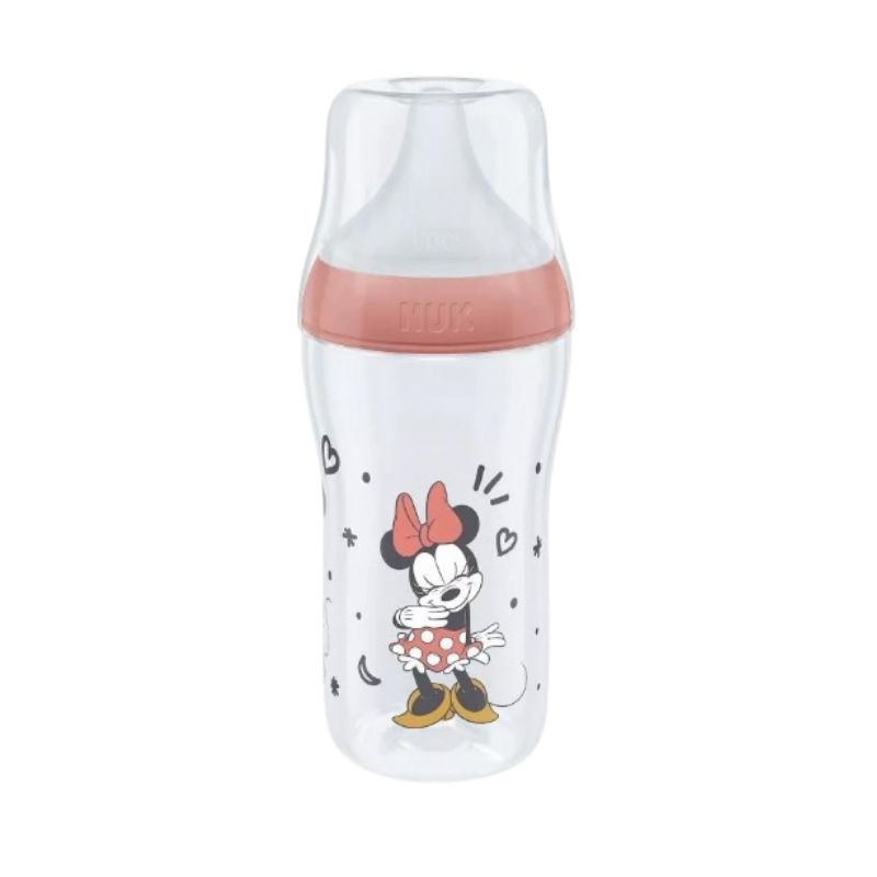 Nuk Perfect Match Biberón PP Tetina de Silicona Flujo M 250 ml Mickey & Minnie Rojo lleva incorporado el control de temperatura para avisarnos si está muy caliente el contenido. También lleva el sistema anticólico de Nuk y la tetina proporciona un flujo más suave de alimento.