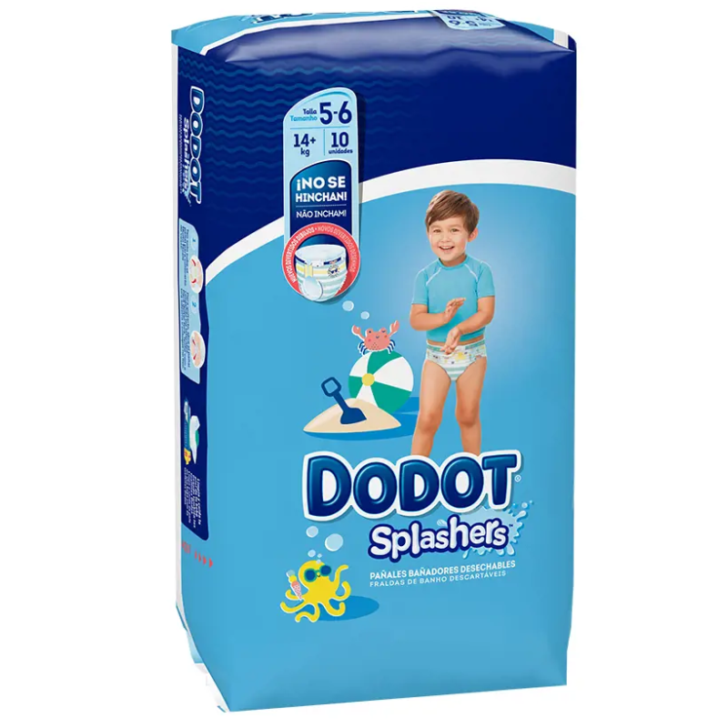 Dodot Splashers es el pañal-bañador desechable adecuado para que tu bebé disfrute de la playa y la piscina en cualquier momento. A diferencia de los pañales normales, no se hincha al mojarse, así que es igual de cómodo tanto dentro como fuera del agua. Además, su diseño de ajuste total 360º cuenta con la protección segura de una doble barrera en la zona de las piernas para evitar las fugas. Podrás cambiarlo fácilmente (incluso mojado) con solo rasgar los laterales, y con sus divertidos dibujos tu bebé se sentirá como si llevara un auténtico bañador. Preparaos para disfrutar juntos en el agua con Dodot Splashers (protección anti escapes en el agua).