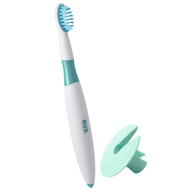 El Set de Cepillo Dental Entrena NUK contiene un anillo protector para evitar que se introduzca demasiado la punta o el cepillo en la boca.