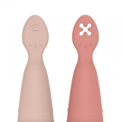 Además, su pequeño tamaño y textura evitan que se llene en exceso, reduciendo la posibilidad de que la comida se derrame. La forma simétrica de los mangos permite el uso con ambas manos, sin necesidad de rotar la muñeca, convirtiendo estas pre-cucharas en el complemento ideal para iniciarse en el método BLW.