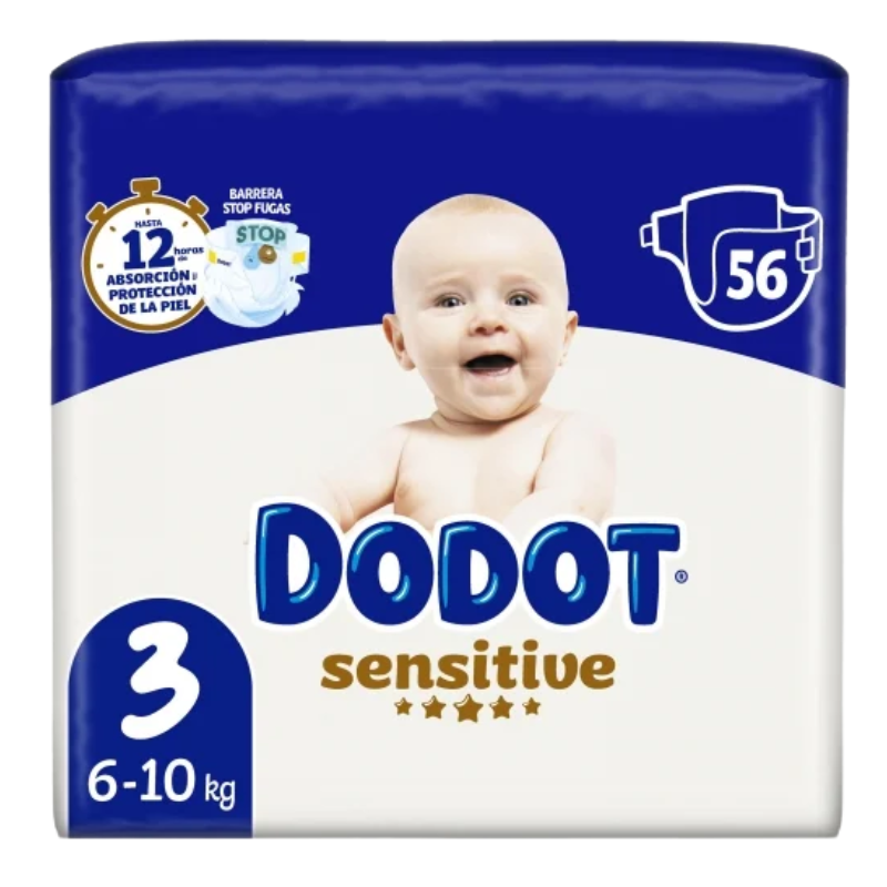 Dodot Pañales Sensitive T3 (6-10 Kg) 56 uds ofrece hasta 12 horas de protección antifugas y cuidado óptimo para la piel, siendo la mejor elección de Dodot para pieles sensibles, especialmente diseñada para la delicada piel de los bebés.