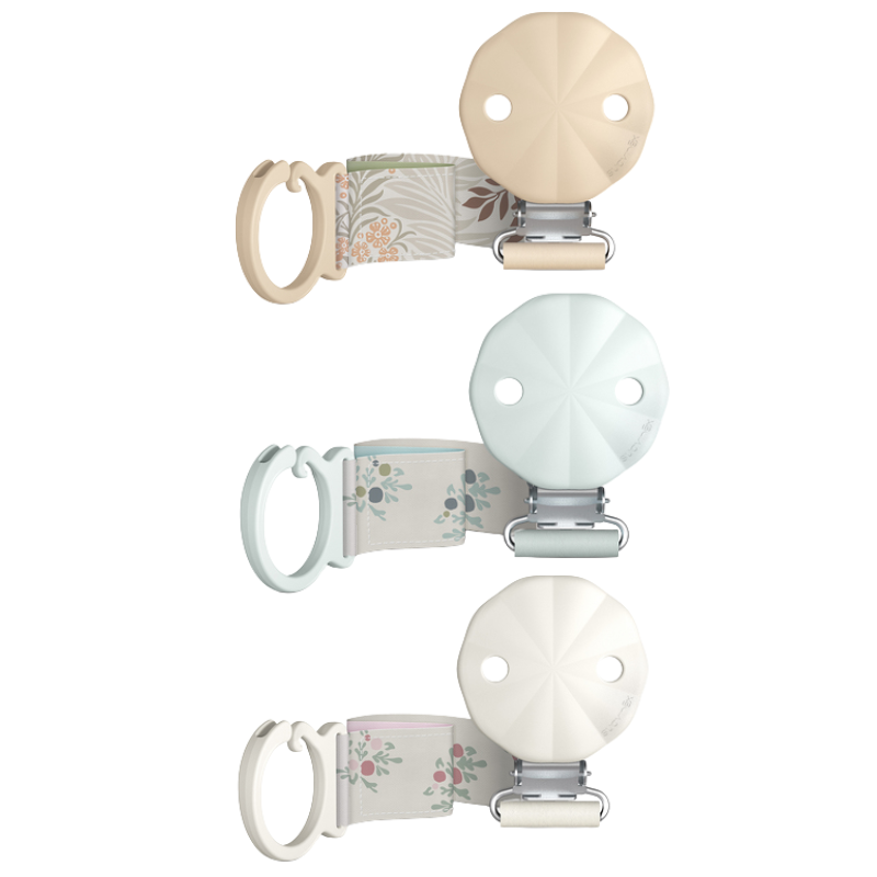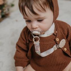 Broche para chupete con cinta de tela. Con cinta textil, remates de polipiel y placa de silicona para clipar a la ropita del bebé.