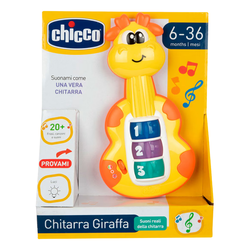 La Guitarra Jirafa de Chicco es un divertido juguete con luces y sonidos diseñado para acercar al bebé al maravilloso y educativo mundo de la música.