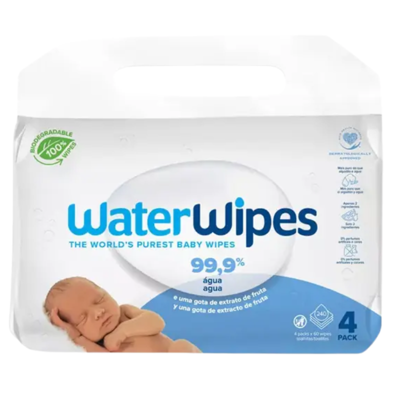 Toallitas para bebés con un 99,9% de agua y una gota de extracto de pomelo que tiene propiedades antimicrobianas.