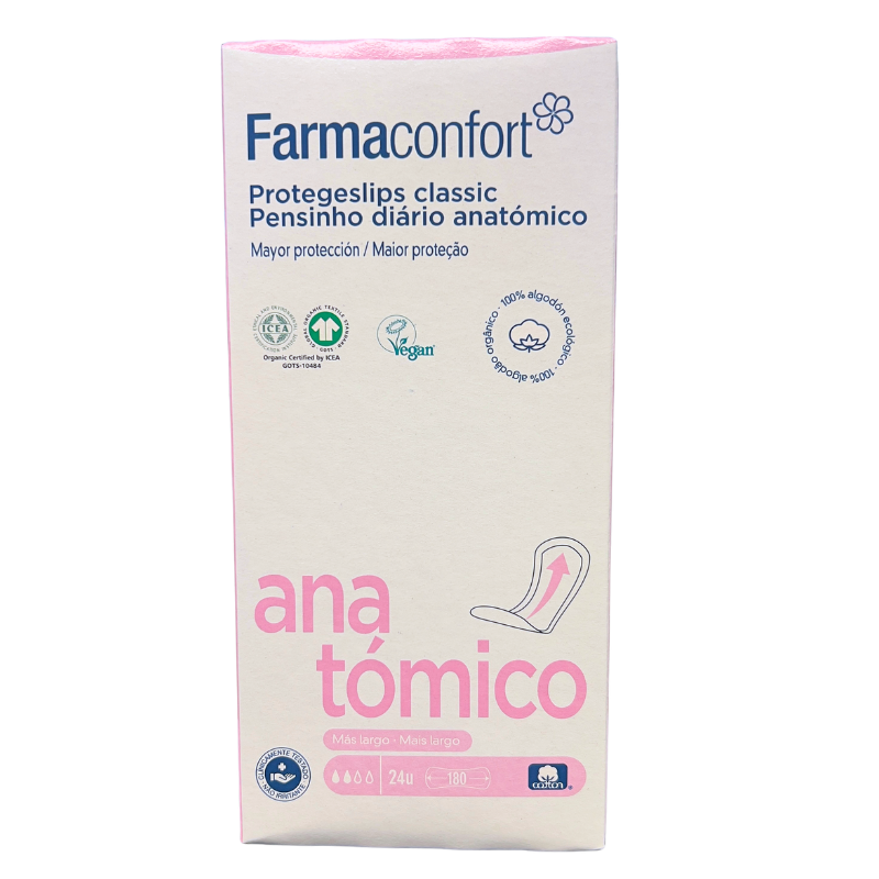 Los Protegeslips Anatómicos Classic FARMACONFORT están fabricados con algodón ecológico 100%, hipoalergénico y dermatológicamente probado. El algodón ecológico se cultiva sin el uso de fertilizantes químicos ni pesticidas, lo que lo convierte en una opción más natural y respetuosa con el medio ambiente. Estos protegeslips tienen un núcleo absorbente de algodón ecológico hipoalergénico que ayuda a prevenir picores, irritaciones y alergias. No contienen perfumes ni polímeros superabsorbentes, y han sido purificados sin cloro ni dioxinas. Su forma anatómica proporciona discreción y comodidad, y son especialmente recomendados para su uso diario.