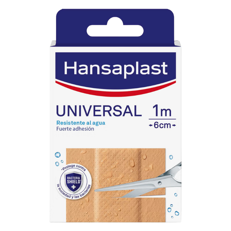 La gama de apósitos Universal de Hansaplast está disponible en los siguientes formatos: en apósitos de diferentes tamaños o en tiras que pueden ser recortadas al tamaño ideal.