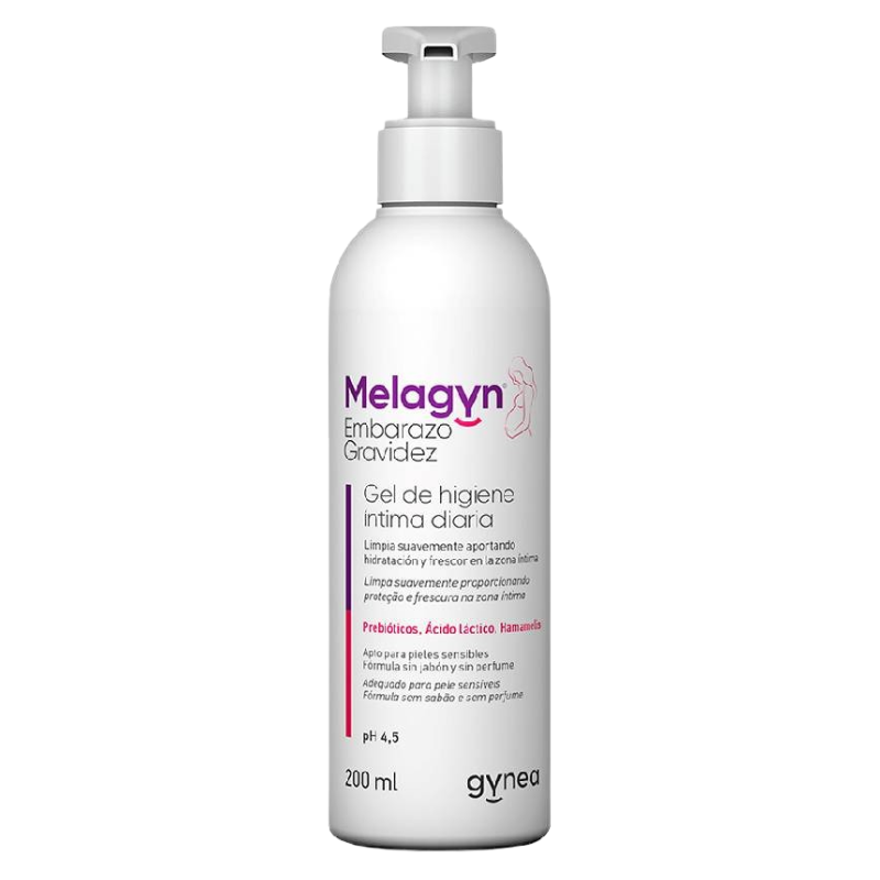 MELAGYN EMBARAZO GEL es un gel dermoprotector para la higiene íntima diaria especialmente formulado para mujeres embarazadas, en postparto y lactancia. Presenta un pH 4,5 que ayuda a mantener el equilibrio ácido natural de la flora vaginal, contribuyendo a prevenir irritaciones, sequedad y molestias comunes en esta etapa. Su fórmula suave, libre de jabón y perfumes, contiene ingredientes calmantes como extracto de hamamelis, aloe vera hidratante, ácido láctico y prebióticos que protegen y regeneran la piel delicada de la zona íntima. Está testado dermatológica y ginecológicamente, y su uso es externo, recomendado una o dos veces al día para una limpieza eficaz y respetuosa. Melagyn Embarazo Gel proporciona confort, hidratación y protección, favoreciendo el equilibrio microbiológico y cuidando la salud íntima durante el embarazo y la lactancia.
