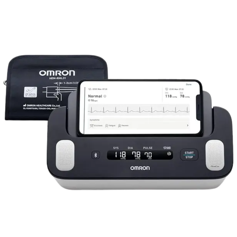 El dispositivo OMRON Complete, clínicamente validado, es un monitor de presión arterial y ECG 2 en 1 que te proporciona resultados precisos de forma fácil e inmediata. Obtén dos lecturas con una sola medición para vigilar tu corazón fácilmente en la comodidad de tu hogar.
