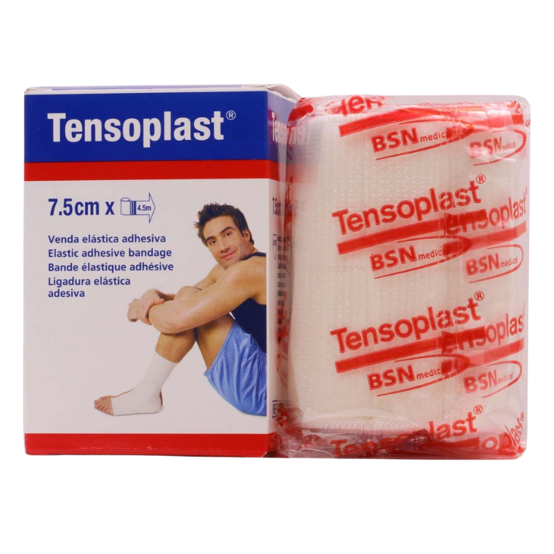 La venda elástica adhesiva Tensoplast está hecha de fibras sintéticas y tejido elástico de algodón 100%, que le da soporte y compresión firme.