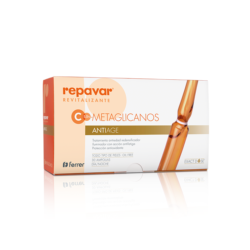Repavar® Revitalizante Metaglicanos Antiage es un sérum intensivo antiedad con acción redensificadora. Innovadora fórmula con C5,5%- METAGLICANOS que actúa activando la síntesis de los componentes estructurales de la piel dando como resultado una piel más joven, tersa y luminosa.