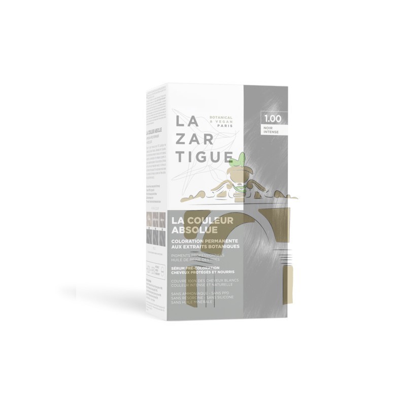 LAZARTIGUE COLORACION ABSOLUTE 1.00 es un kit de coloración capilar permanente que incluye un pre serum, un oxidante, una crema colorante y una mascarilla post coloración.