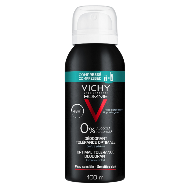 Desodorante 48H para hombre en spray de Vichy, hipoalergénico, con 0% de alcohol y envase reciclable ecocomprimido.