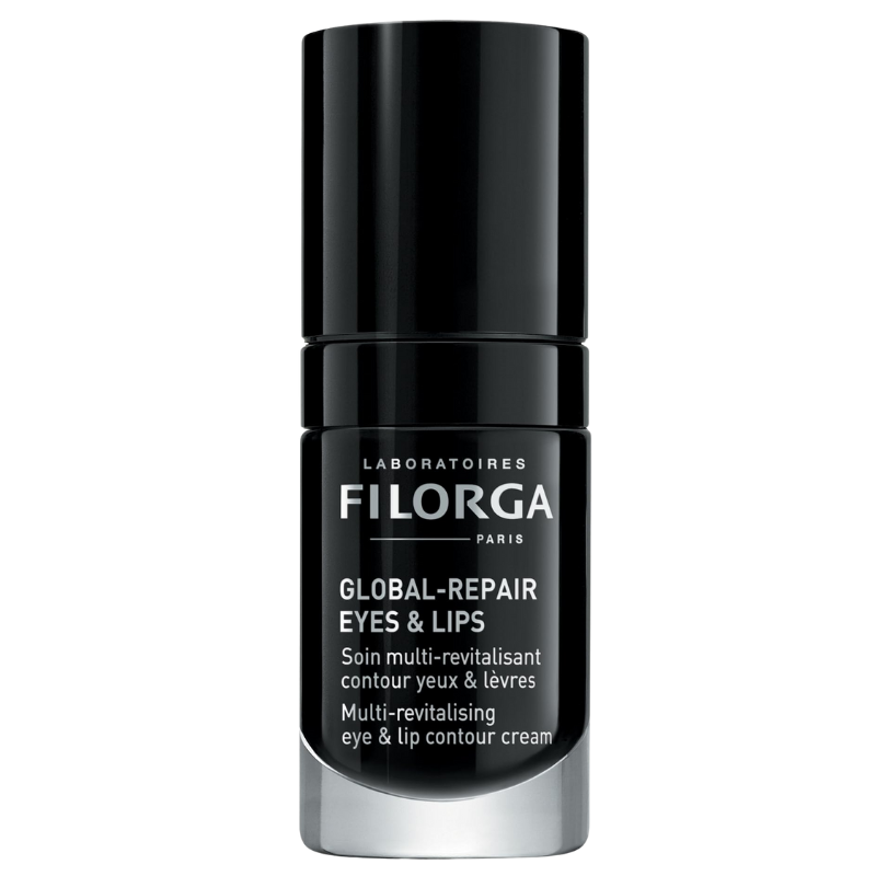 El Contorno de Ojos y Labios Global Repair Eyes & Lips de Filorga es un tratamiento antienvejecimiento diseñado para el área de los ojos y labios. Contiene un dúo de ingredientes activos de origen vegetal que proporcionan una acción ultra-dirigida. Incluye un activador de microcirculación extraído de la tuberosa, que ayuda a combatir signos de envejecimiento como ojeras, bolsas y arrugas en el área de los ojos. También contiene un ingrediente suavizante derivado de la semilla de sésamo que estimula el almacenamiento de lípidos, contribuyendo a suavizar y remodelar el contorno de los labios. Mejora la apariencia del pliegue nasolabial y las arrugas del labio superior. Es adecuado para todo tipo de piel.