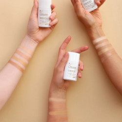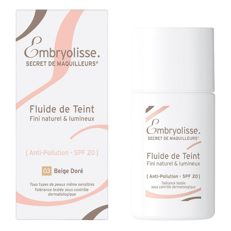 Maquillaje fluido tono beige dorado con SPF 20 para todo tipo de piel, incluso las sensibles.