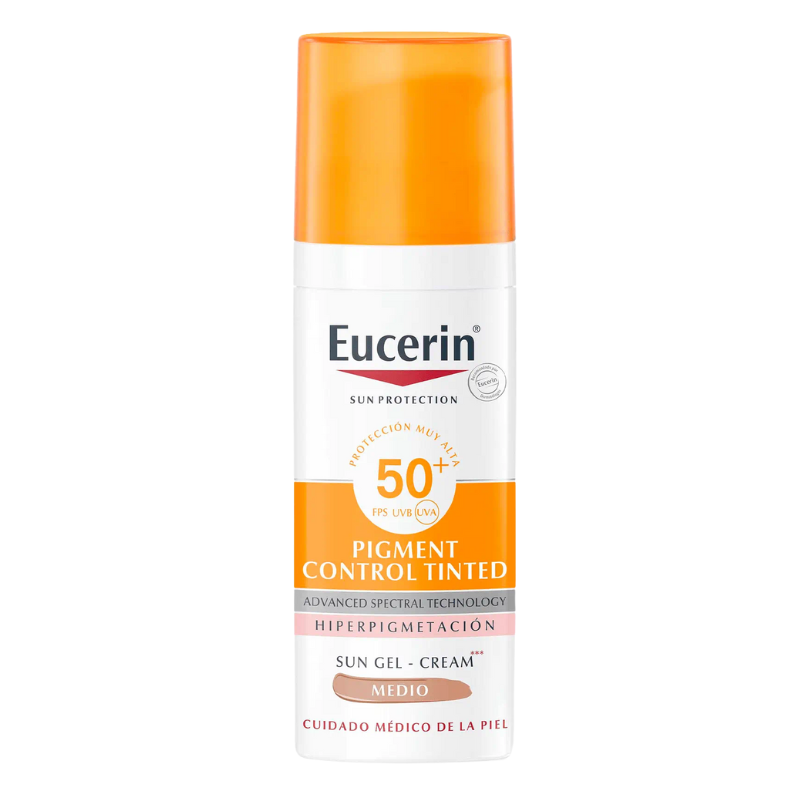 Eucerin Sun Pigment Control FPS 50+ con color tono medio es un protector solar facial para todo tipo de pieles que previene la hiperpigmentación