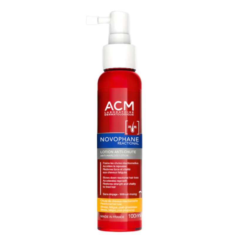 La loción reactiva para el cabello Novophane retarda la caída reactiva del cabello relacionada con el estrés, la fatiga o el embarazo y estimula el crecimiento del cabello existente.