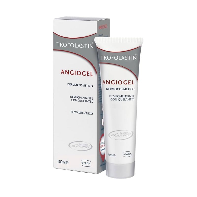 Trofolastin Angiogel 100ml es un dermocosmético que normaliza las pigmentaciones inestéticas de la piel, de color amarillo parduzco, que quedan una vez ha desaparecido un hematoma. Refuerza la pared vascular, evita la formación de edemas y mejora la circulación. Contiene ingredientes activos, entre los que destacan quelantes y anti radicales que permiten la normalización de pigmentaciones.
