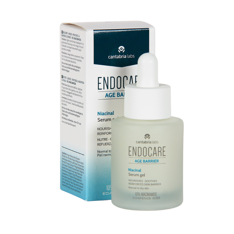 Endocare Age Barrier Niacinal Serum gel 30ml es un serum hidratante formulado con un 10% de niacinamida que activa la función barrera y ácido hialurónico en nanovesículas que potencia la hidratación. Protege, calma y repara la función barrera de la piel tras el uso de retinoides, radiación UV, láseres etc. Además, aumenta la elasticidad de la piel y reduce los signos de la edad. Textura fresca, aterciopelada y no comedogénico.