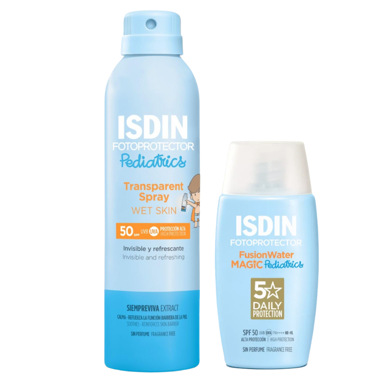Pack solar pensado para los más pequeños de la casa. Incluye fusion water magic pediatrics 50ml + transparent spray pediatrics 250ml