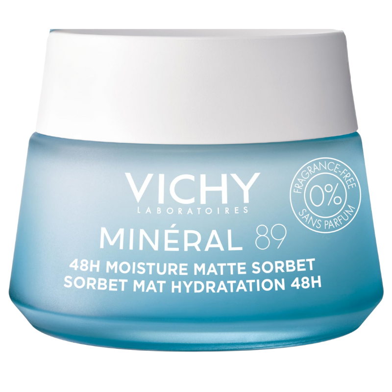 Sorbete hidratante y matificante instantáneo. Minéral 89 Gel Sorbete Mate Hidratante 48H proporciona una hidratación duradera con una sensación refrescante y ligera en la piel. Diseñado específicamente para pieles mixtas y grasas, es no comedogénico.