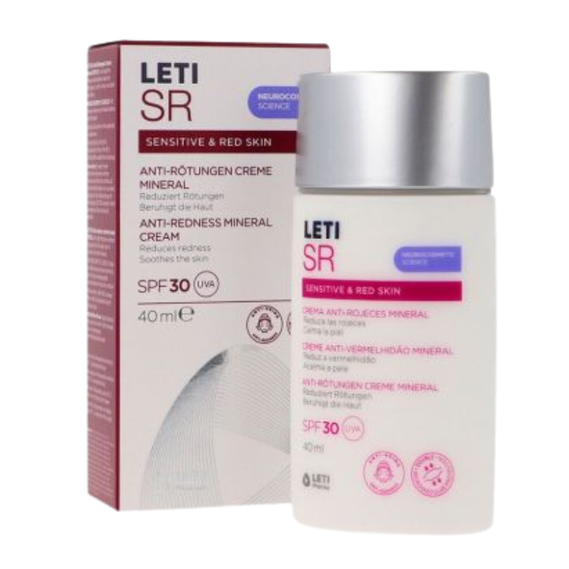 Leti SR Crema SPF30 es una crema antirojeces mineral, especialmente diseñada para proteger las delicadas pieles reactivas y sensibles. Igualmente, está creada para prevenir y tratar el envejecimiento cutáneo, los daños causados por la luz azul y la polución. Su fórmula con ingredientes naturales, ayuda a calmar y proteger las pieles sensibles y reactivas.