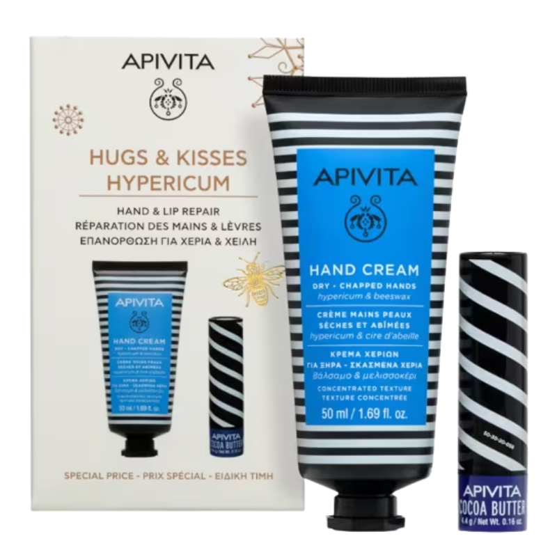 Este pack de manos y labios de Apivita contiene una crema para manos secas y agrietadas y un bálsamo labial con manteca de cacao y SPF20.