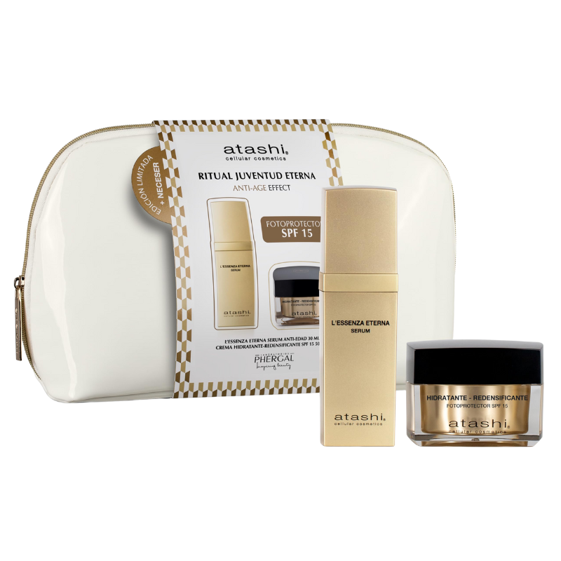 El sueño de toda beauty addict. Este set de Atashi Cellular Cosmetics incluye el sérum L’Essenza Eterna y la Crema Hidratante Redensificante SPF 15. Juntos, combaten los signos de la edad, revitalizan la piel y la protegen del fotoenvejecimiento. Perfecto para quienes buscan un cutis rejuvenecido y luminoso. Sin duda, es el cofre infalible para regalar(te) un cuidado antiedad integral.