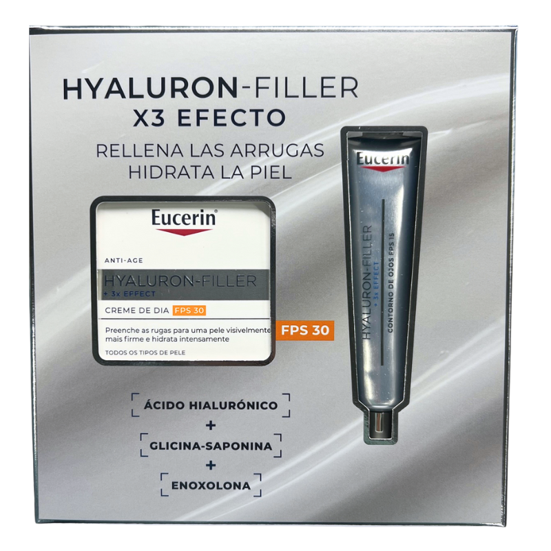 Pack Eucerin Hyaluron-Filler x3 Efecto con crema de día FPS 30 y contorno de ojos. Rellena visiblemente las arrugas, hidrata intensamente y protege la piel frente al envejecimiento prematuro. Ideal para todo tipo de piel.