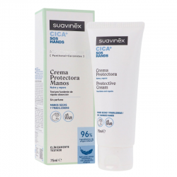 Crema Protectora de Manos Cica+ SOS de Suavinex está diseñada para actuar como tratamiento de rescate en manos con piel seca o fragilizada. Su fórmula reparadora y protectora ayuda a restaurar la barrera cutánea, además, tiene una textura fundente y de rápida absorción.
