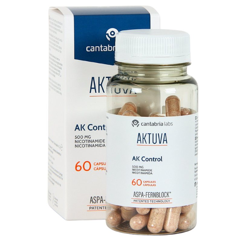 Aktuva AK Control Cápsulas es un complemento alimenticio diseñado para abordar la reparación de la función barrera y la reparación del daño fotoinducido en el ADN desde el interior en las pieles con queratosis actínicas. Combina la potente patente exclusiva Aspa Fernblock y Nicotinamida que proporciona un novedoso mecanismo de reparación del ADN (VDR).