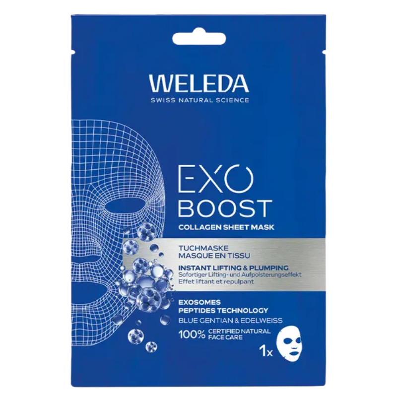 La mascarilla de tejido con Collagen+ Active Complex y la innovadora EXOSOMES PEPTIDES TECHNOLOGY proporciona una piel visiblemente más rellena y firme desde la primera aplicación.