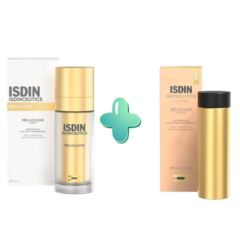 Isdin Isdinceutics Melaclear Sérum 30ml + refill es un sérum antimanchas que contiene ácido tranexámico para reducir las manchas en un 71%. Este sérum facial despigmentante ofrece resultados visibles en 14 días y ayuda a lucir una piel uniforme y radiante.